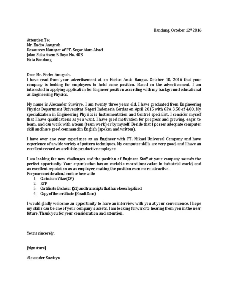 I completed my bachelor degree in oil and gas engineering from universitas merdeka raya. Thank you for the attention. Berisi kepada siapa surat tersebut ditujukan. Surat lamaran kerja bahasa inggris job application letter in english to: I was very excited when i found out this job was available.